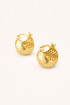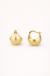 Rounded volume with an intentional contrast. The exterior presents a softly irregular texture that breaks light into small, shifting highlights, while the inner surface reveals an open lattice structure that keeps the form visually light. The result is a compact hoop with presence, designed to sit close to the ear without feeling dense.